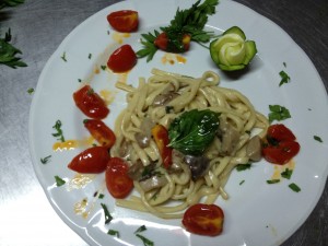 Ma ecco un’altra idea per una ricetta. Trifoliamo delle zucchine in padella, dopo aver soffritto un peperoncino all’aceto. Tagliamo a cubetti della pancetta, magari anche questa di produzione artigianale, se possibile, e saltiamola insieme alle zucchine. Dopo aver scolato la pasta, aggiungere il contenuto della padella a caldo e della mozzarella di bufala a cubetti precedentemente tagliata. Se poi si vuole proprio esagerare col gusto, si possono aggiungere anche altre verdure, come melanzane sottolio, funghi trifolati, pomodorini freschi e della rucola a julienne. Il risultato sarà davvero stupefacente, soprattutto se durante la cottura in padella si aggiunge anche una piccola spolverata di tartufo, ché con le castagne ci sta benissimo.